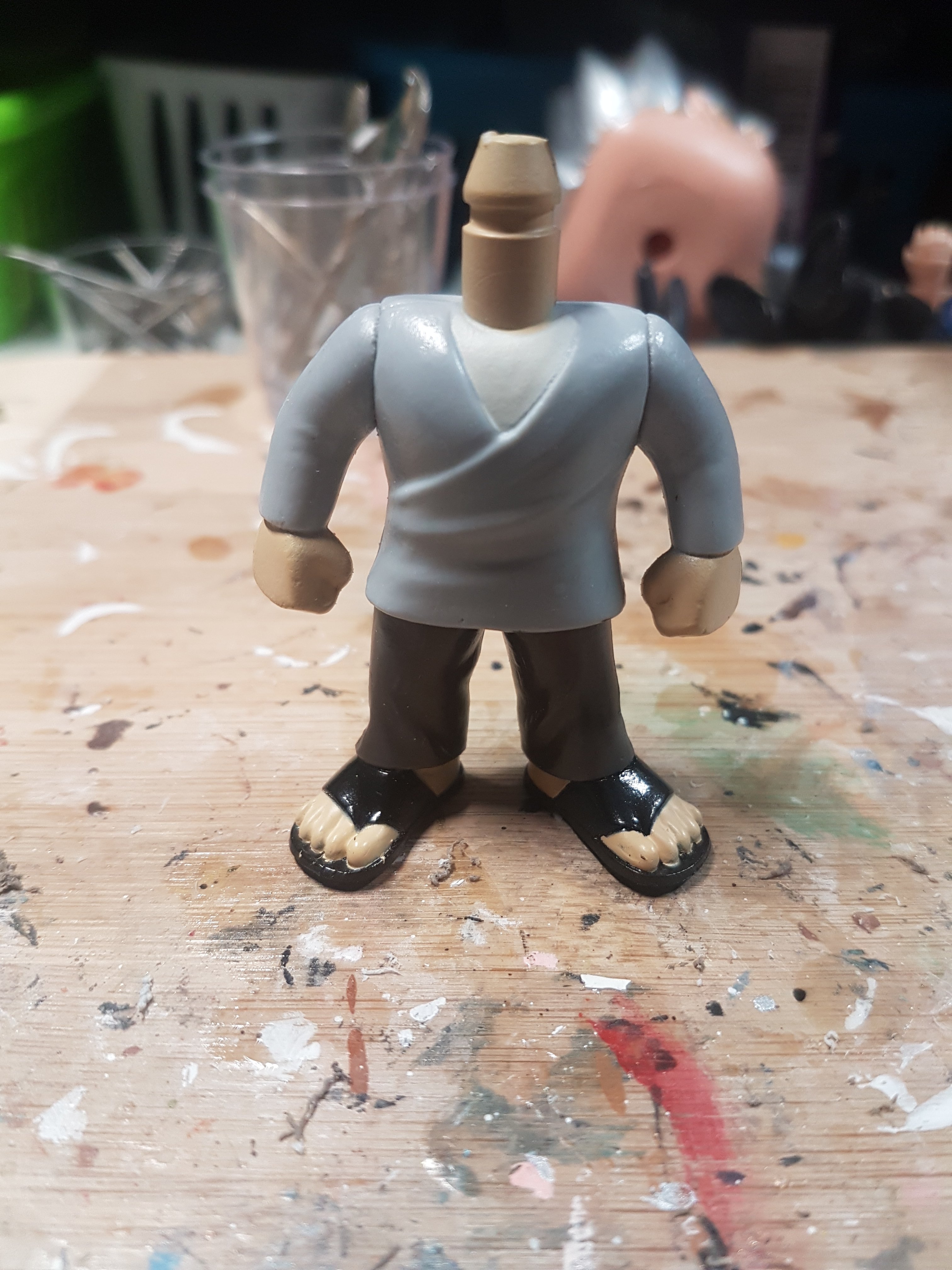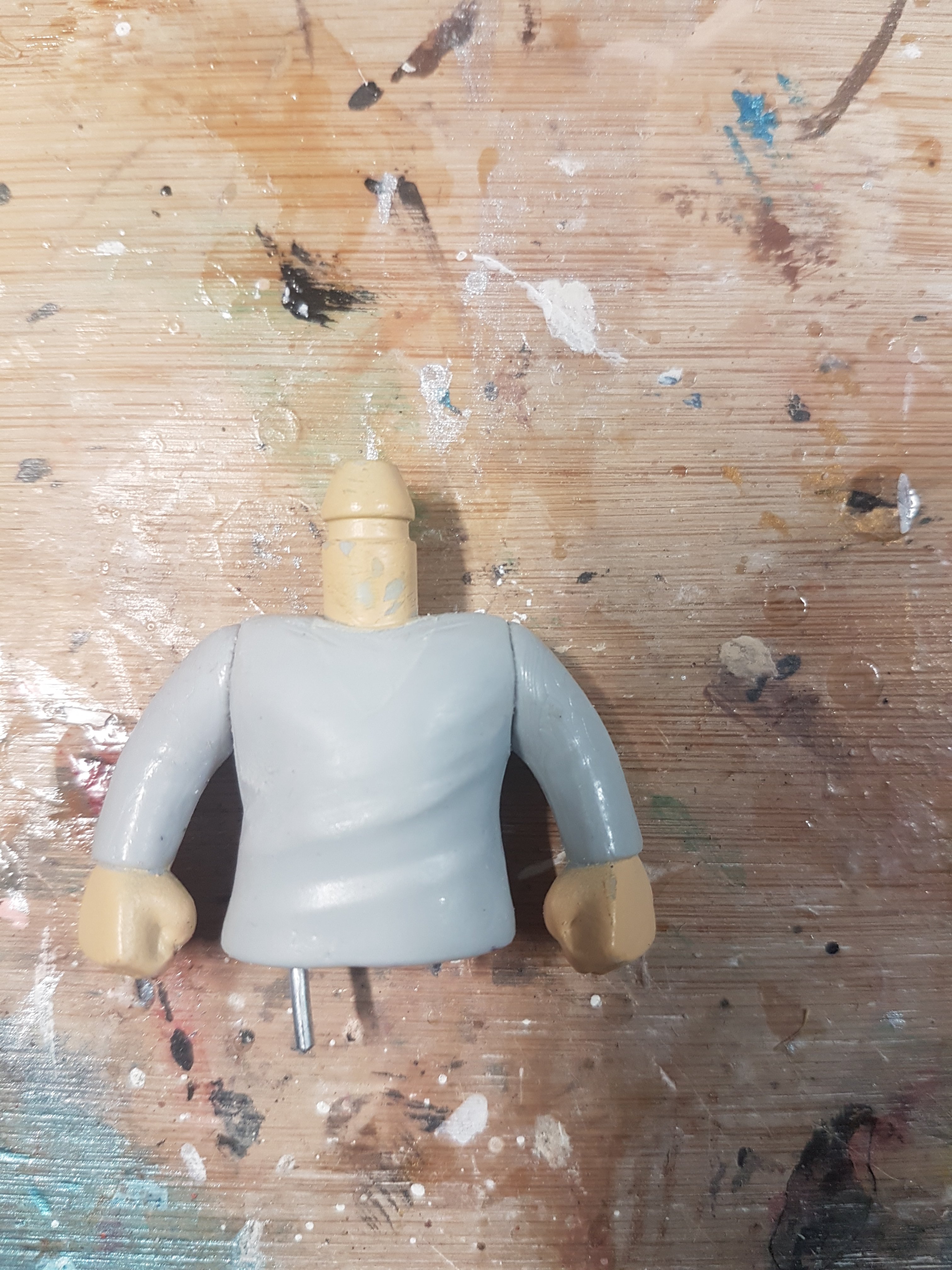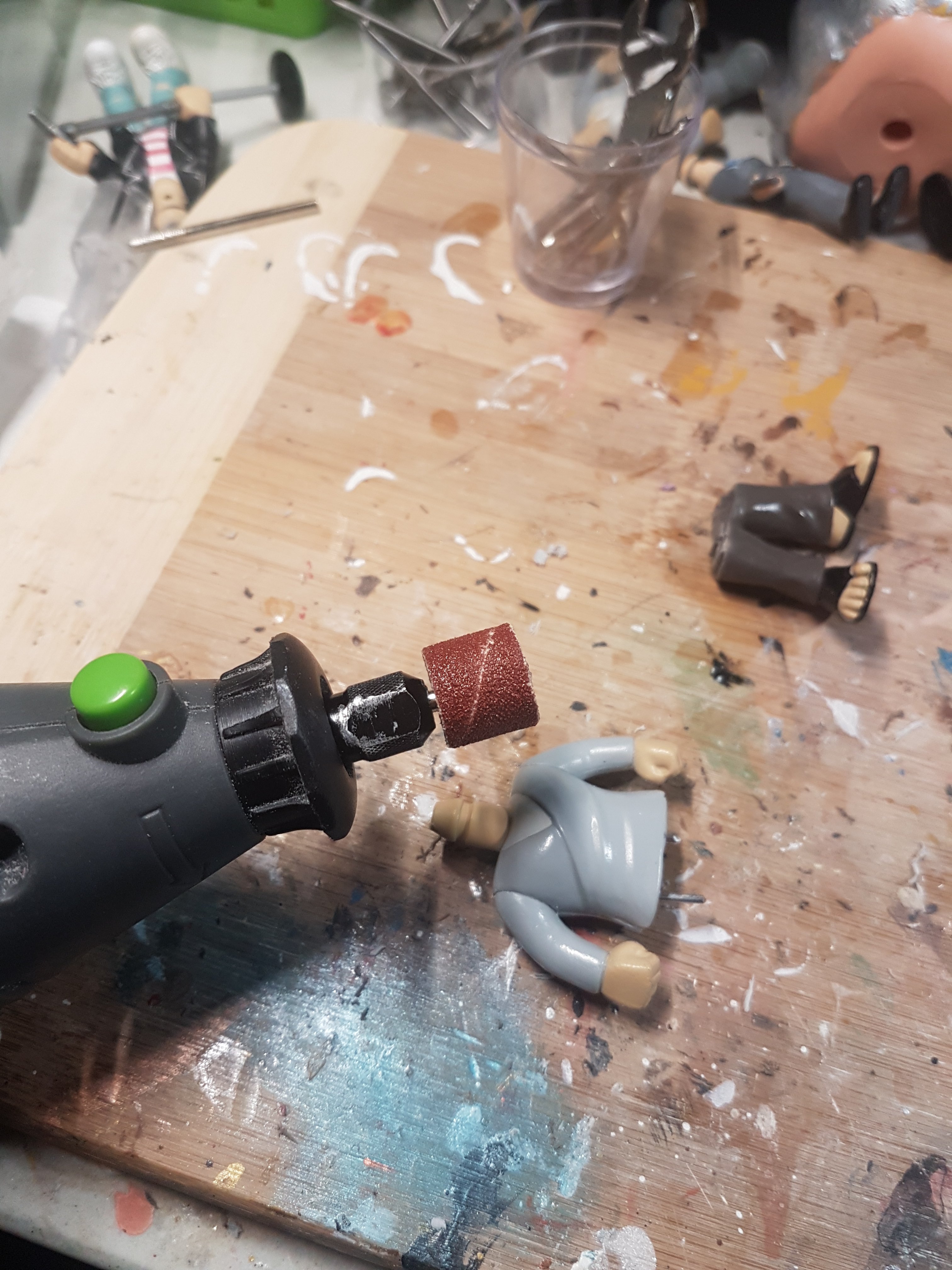 I wanted Misha to have a Random Acts t-shirt on, so I needed to smooth out the existing shirt. That is done with a Dremel, heat gun, and fine sandpaper until I get it smooth enough to be a t-shirt but leaving enough wrinkles to look more natural.