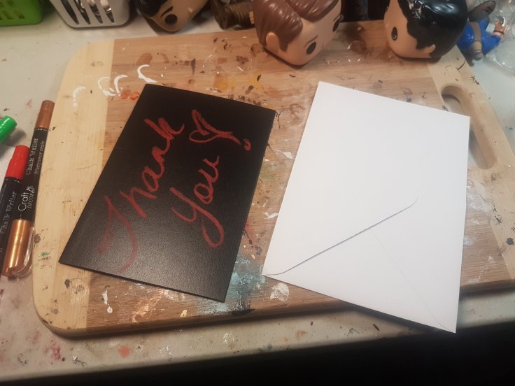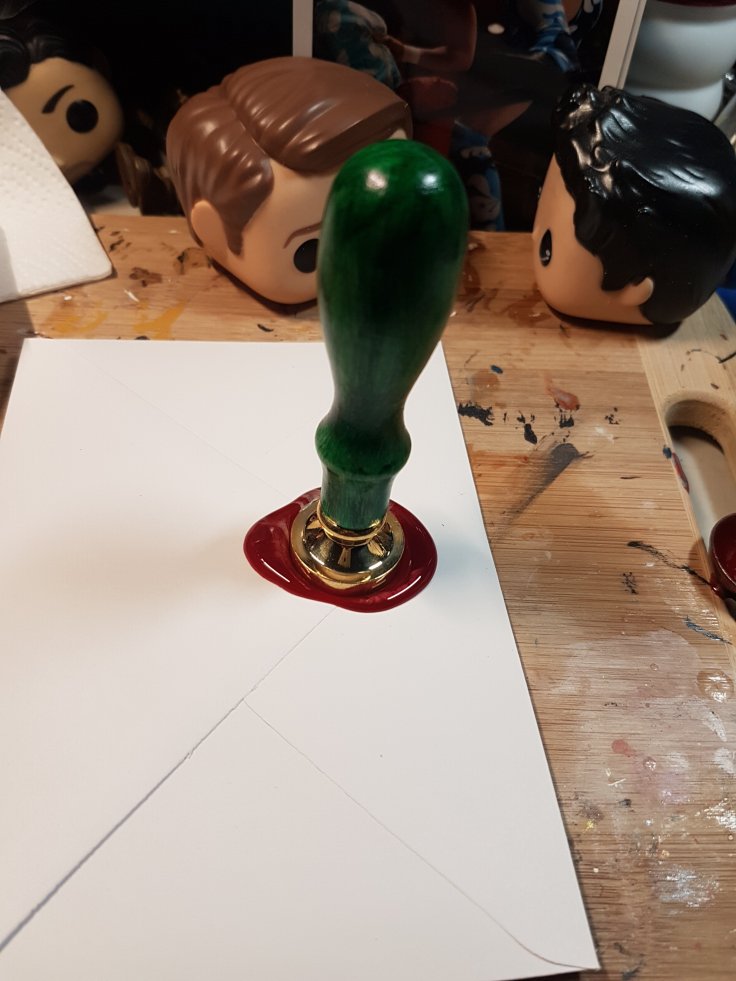 The pop now gets bubble wrapped and a box is sized up for it. I’m lucky in that I rarely have to purchase boxes, but it does mean some extra packing sometimes. extra space is usually filled with air bags. Then the thank you note. I used to hand draw all of them and seal them with wax, but that became too time consuming. Now they are preprinted cards with care instructions that I will add my personal note to. I can still seal with wax when I have time. An AKF item goes in as a thank you gift and the box is sealed.