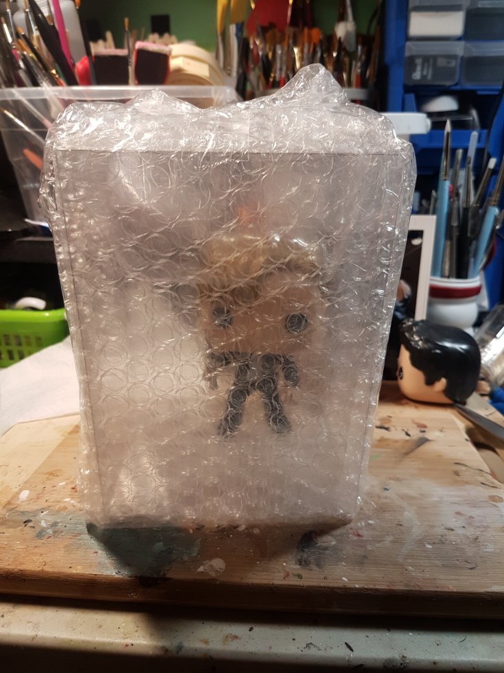 After the pops have dried for a few days, they need an insert. Some pops can go into an insert as is, but most need some sort of modification for accessories, heads, wings etc. That’s where it gets tricky. The one in the picture here is AU Jack. He’s a good one, as I can use the base insert for his body (Scott McCall, usually) and it will fit his head, and as he’s a Mag Wing pop, his insert doesn’t need to be cut to accommodate permanent wings, they get packed separately. The insert goes into a soft pop protector. This holds them secure, and can be used for display. To be honest, I don’t like making custom boxes, because they hide the pop. I want people to be able to see all of it.