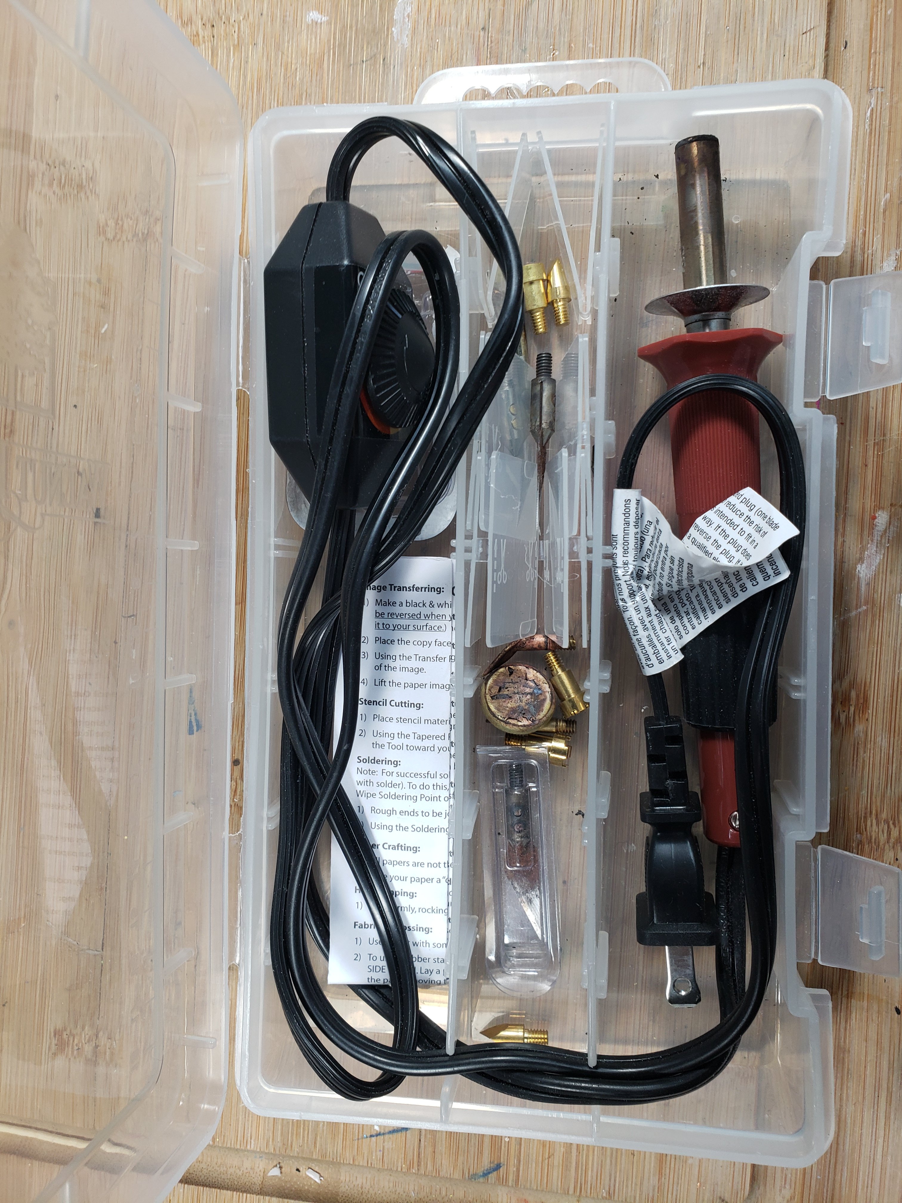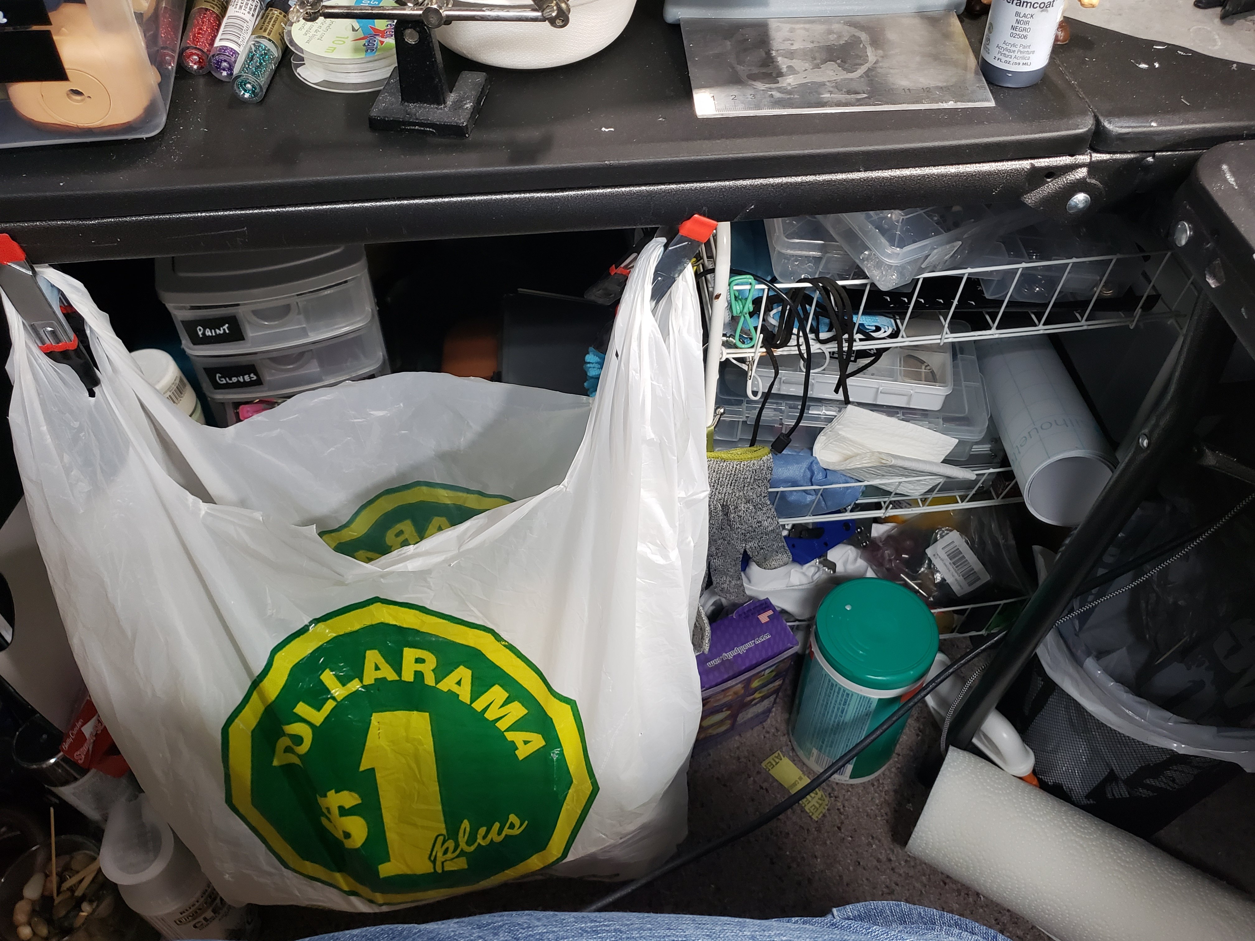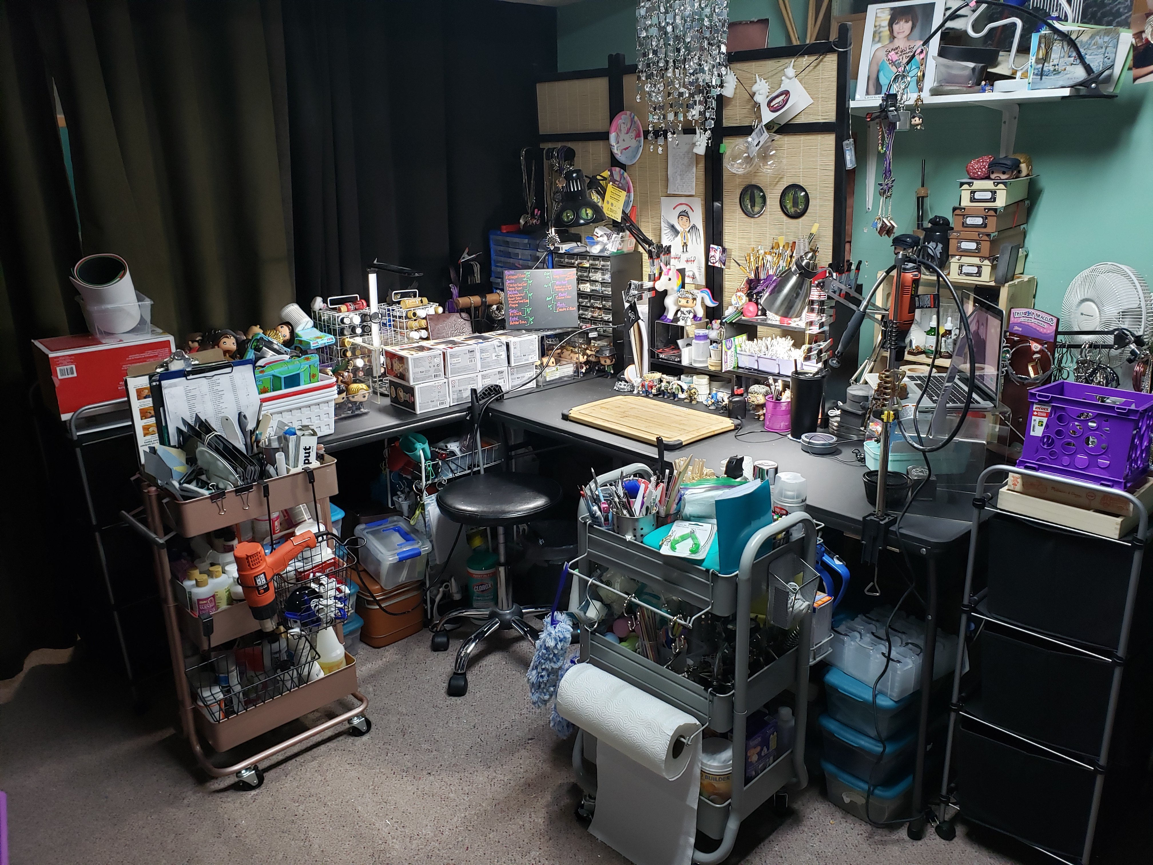 I’ll start with the basic layout. I use an L shape comprised of two plastic tables. I also have a wooden tray table that is supposed to be put away at some point, but .. meh. The wooden table holds my Windows laptop, so it’s used for references and entertainment. Directly in front of where I sit is the cutting board that I work on 90% of the time in an effort to reduce the damage to the table. It’s easier to replace a cutting board. In front of that is the shelving that holds disposable supplies, brushes, acetone and such. Most importantly is my mascot, King Jensen, unicorn and Bacchus coin. Above are things that make me smile.