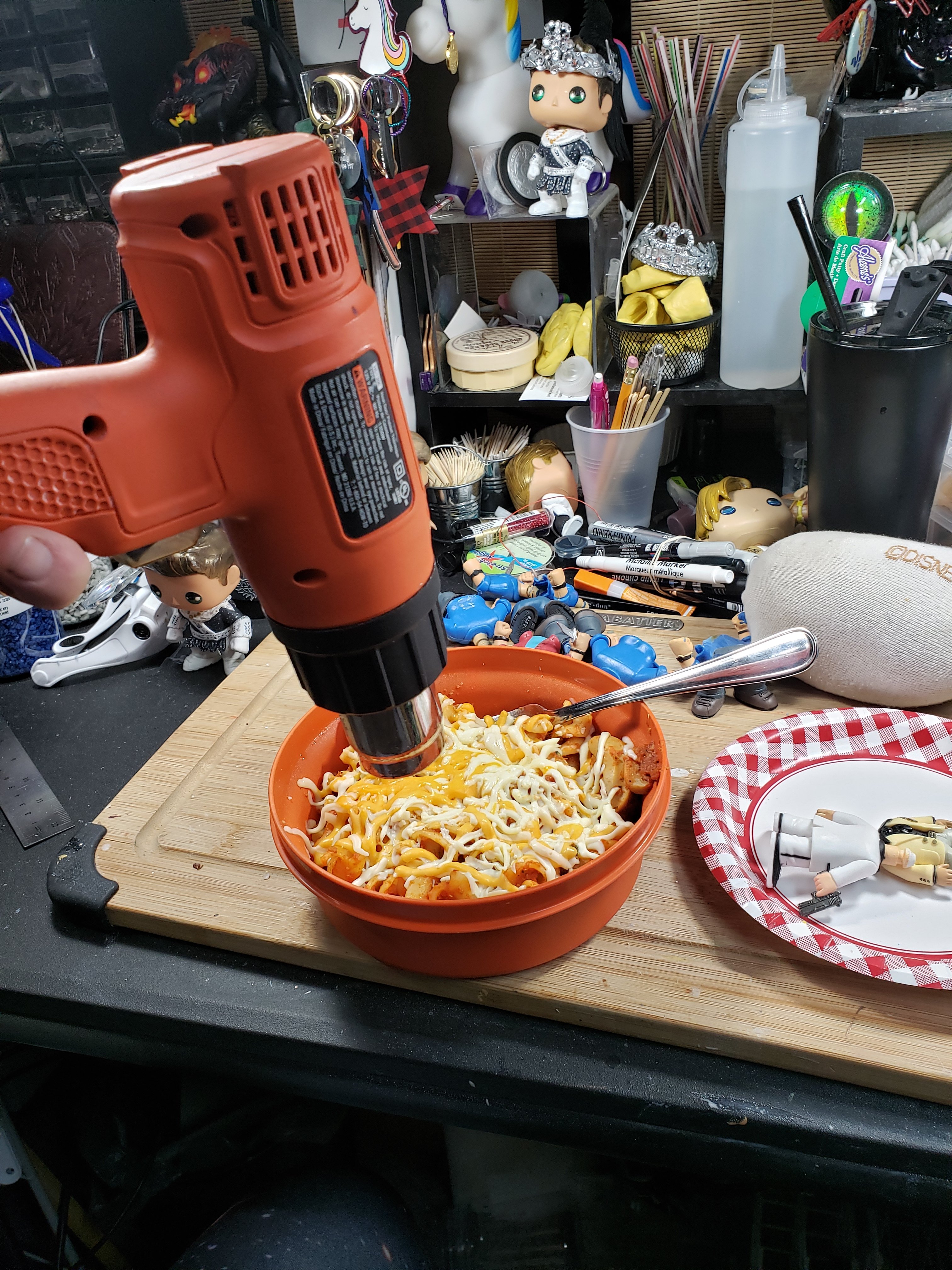 My Heat Gun is the 2nd of the 2 most used items. It cures polymer clay, heats pops to move arm/leg positions, softens glue to take them apart, heats plastic to form into shapes and occasionally heats up my lunch! I have a Black and Decker dual temp gun, but started with a craft heat gun meant to heat embossing powder that I bought at the craft store for 19.99 that worked just fine. The scale of what I do made it impractical but for most that, or even a good hair dryer may accomplish what you need. You can use an oven to cure sculpy and that works fine, I just don’t want to keep schlepping upstairs, so the heat gun is quicker and more direct for me.