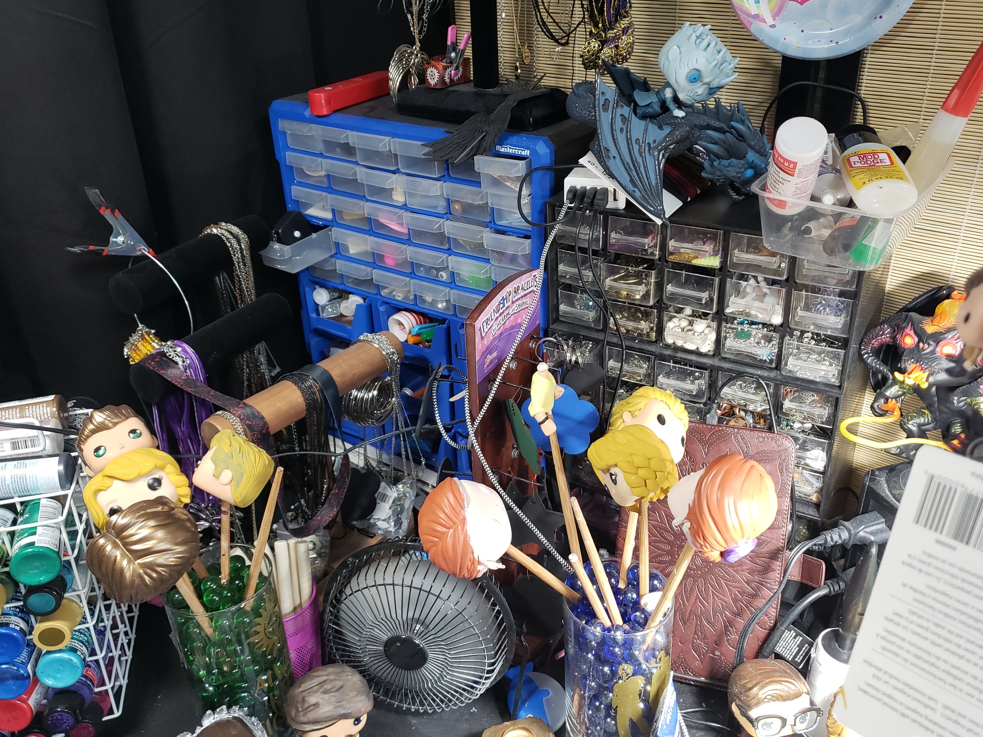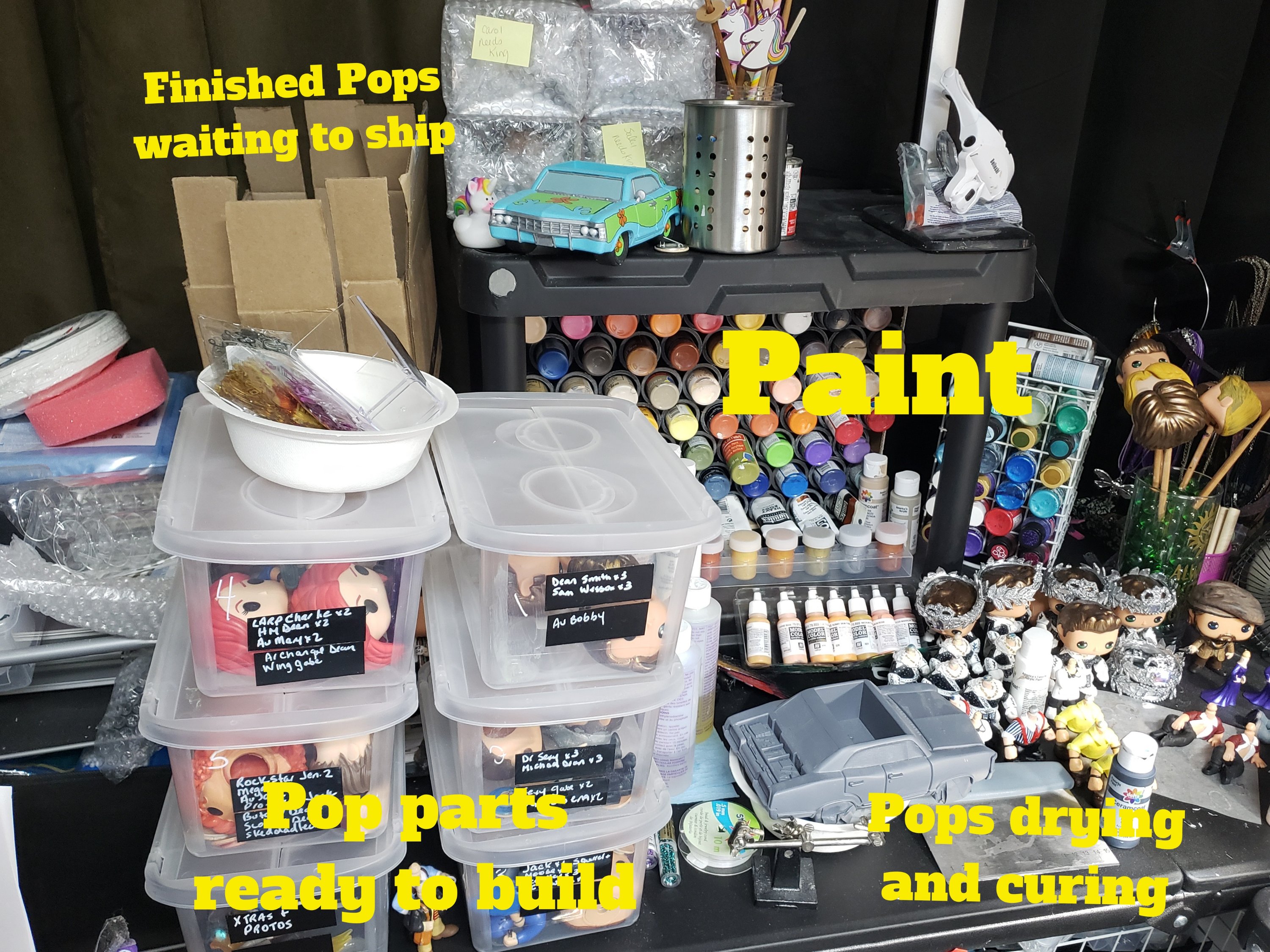 To my right will be broken into 2 areas. Pops and Jewelry/etc. For Pops, this is where the containers of pops on the go are stored and labelled. Weekly I go through new orders and gather the supplies (bodies) I need, break them down and sort. This lets me grab parts I need quickly. Also is my main paint storage, made from PVC pipe. I kinda love it. My metallic paints are in the separate holder for ease. Above that is a light, finished pops waiting for the rest of their orders and my bits for the Dremel.