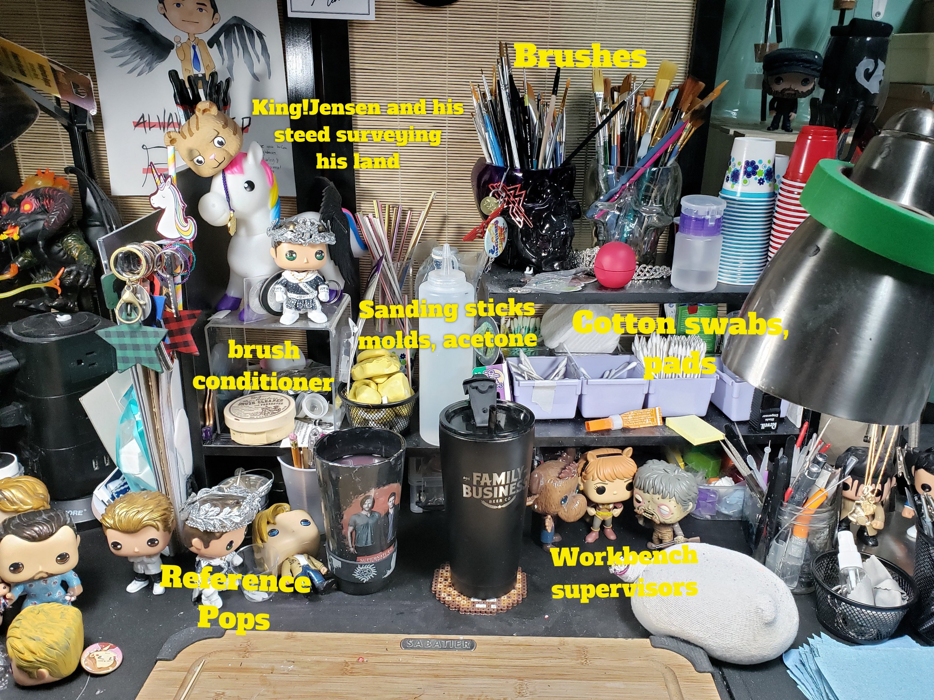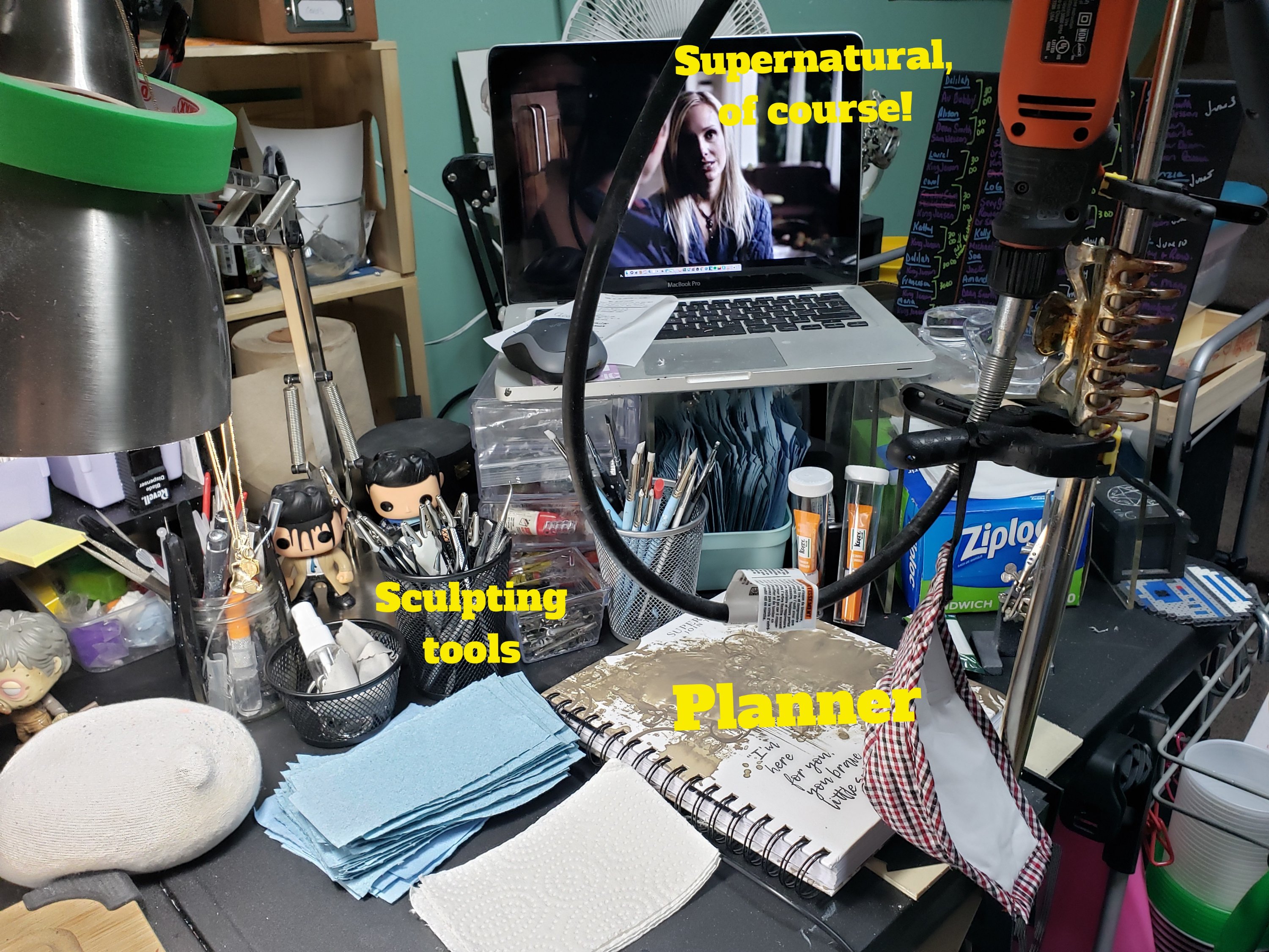 To my left is my planner, Mac (used for watching Supernatural while I work) and containers with sculpting tools, sharps, glue and my workbench list sorted by due dates. Below that is a set of drawers with plates (my palette at times), small tools, AKF raw materials, overflow paint and specialty paint (colour change, metal finish and such)